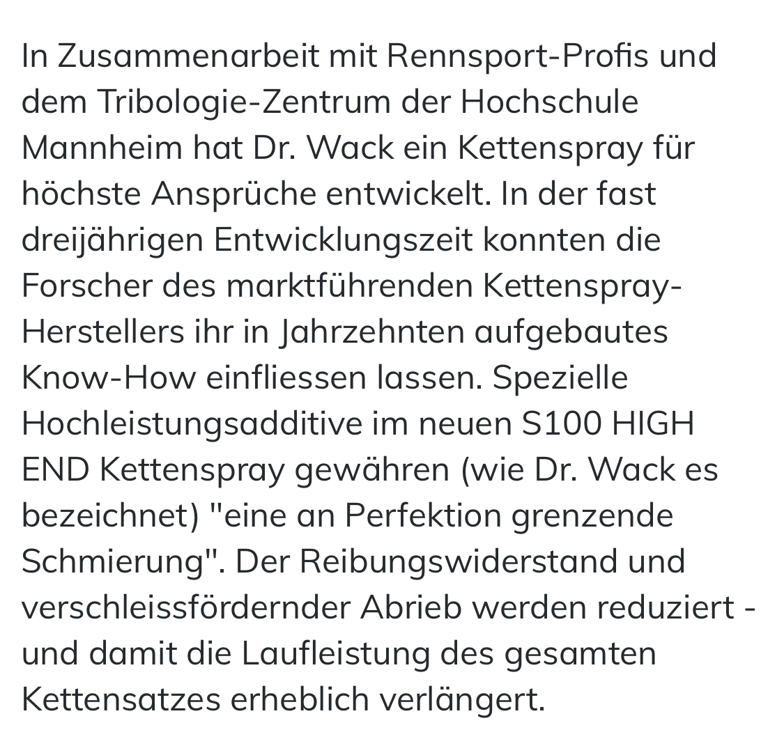 Hab das für meine Rennsemmel im Rennbetrieb im Einsatz. Macht mir einen ziemlich guten Eindruck. Gut, muss sowieso definitiv öfter nachschmieren, da unter diesen Anforderungen das Zeug dann relativ fix von der Kette geworfen wird, wobei ein Restschmierfilm schon noch vorhanden ist. Auch unter Luft:36*, Asphalt: 55*, und gefühlten 17Millionen Schaltvorgängen am Tag (V2 sei Dank 🤣) läuft alles wie geschmiert. Abwurf bzw. Dreck ist am Rennhobel eh egal. Ist ein Sportgerät. Wie von Hersteller angegeben, für höchste Ansprüche. Im Gegensatz zu dem weissen Spray, verteilt sich das bei der Anwendung wesentlich besser und schmiert feiner. Man merkt schon einen Unterschied. Für auf die Strasse und auf der Hyper … reichen die „normalen“ Schmiermittel ganz sicher auch. Mega Nachteil an dem Produkt ist, dass der Sprühkopf immer irgendwie verstopft. Richtig nervig! 😑- 97 replies