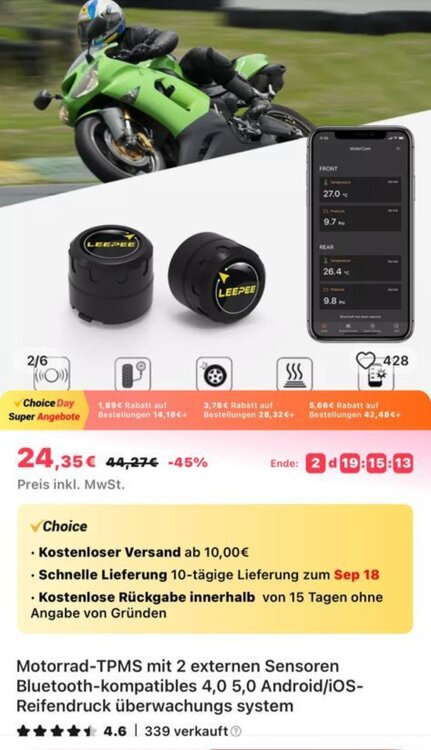Kostete 25,-€ bei Ali, ist eigentlich wie tyreboy, nur dass man keinen 80er Jahre Bildschirm hat, sondern die Anzeige auf dem Handy in einer App. Sollte der Reifen Luft verlieren, kann man untere, aber auch obere Warngrenzen angeben, dann ertönt eine Warnung im Handy (Sena). Mir geht es da eher um die 10g bei ausgewuchteten Felgen....