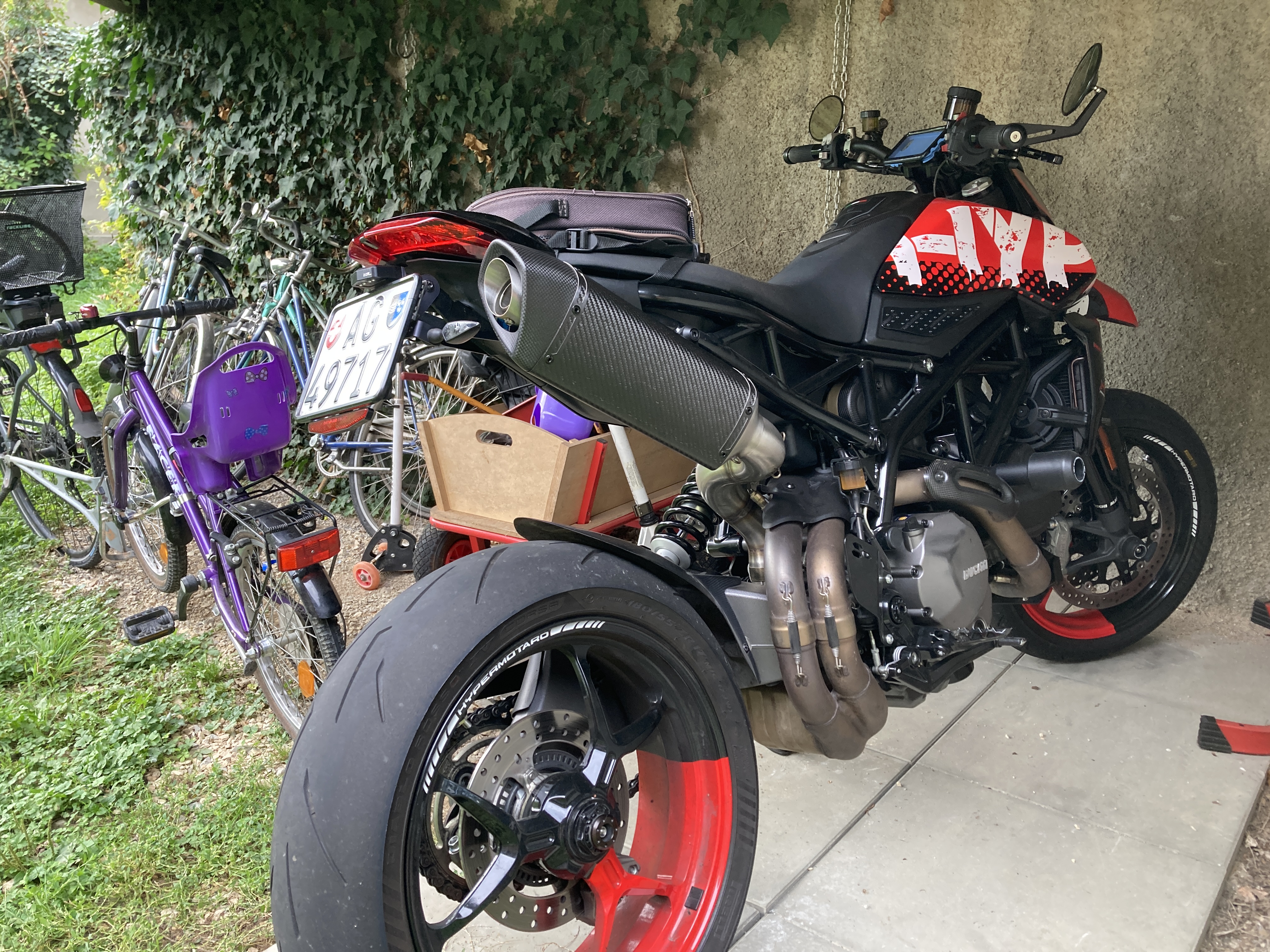 danbre Posted September 21, 2023 Share Posted September 21, 2023 vor 11 Stunden schrieb korolead: Hier noch ein erstes Fazit über den Exan Schalldämpfer: Aussehen: - Sieht Top aus, gibt der Hyper eindeutig ein Supermotomässiges aussehen und speckt das Heck ab. Gewicht: - Schalldämpfer 1468g, Zwischenrohr 500g = Total ≈ 2000g (Original 2x 1850g + 740g ≈ 4450g) Ergibt ein Gewichtsersparnis von +- 2450g. Sound: - Auweija auf was habe ich mich da eingelassen 😱! Werde diesbezüglich nach der ersten Fahrt weiter berichten 😉. Verarbeitung: - Das Exanlogo wurde an der Manchette Lasergraviert und sieht klasse aus. - Das Carbon an der Endkappe ist glatt, das am Schalldämpfer rauh, beide sind matt. - Als ich die zwei Schrauben des Halters, zwecks Lackierung (habe den Halter schwarz lackiert) rausgeschraubt habe, haben sich die dahinter liegenden Muttern im innern verbaschiedet, sind inwärts an der Carbonhülle also nicht befestigt! Zum Glück habe ich diese durch etwas rütteln wieder zu den Bohrungen bringen können 😅. -Das Zwischenrohr kommt zu nahe an die Fahrwerksfeder. - Es wurde nur eine Feder (statt zwei) geliefert und diese war noch zu kurz. Positiv bis jetzt ist die Kommunikation mit dem CH-Importeur. Habe ihm die verlangten Fotos zugeschickt und warte nun auf eine Rückmeldung. Kollateralschaden (wenns man so nennen wil): - meine oben gelegten Blinker mussten nach unten weichen da der linke voll im Abgasstrahl war. Alles in allem bin ich, vor allem bezüglich der Standfestigkeit bzw. wie lange er hält, noch nicht überzeugt. Das mit den Haltefedern kann passieren, dass das Zwischenrohr jedoch zu nahe an der Fahrwerksfeder liegt gefällt mir überhaupt nicht. Ich halte euch weiter auf dem laufenden ✌️ Hast du ein Lautstärkevergleich zu den bekannten anderen ESDs? Quote Link to comment Share on other sites More sharing options...