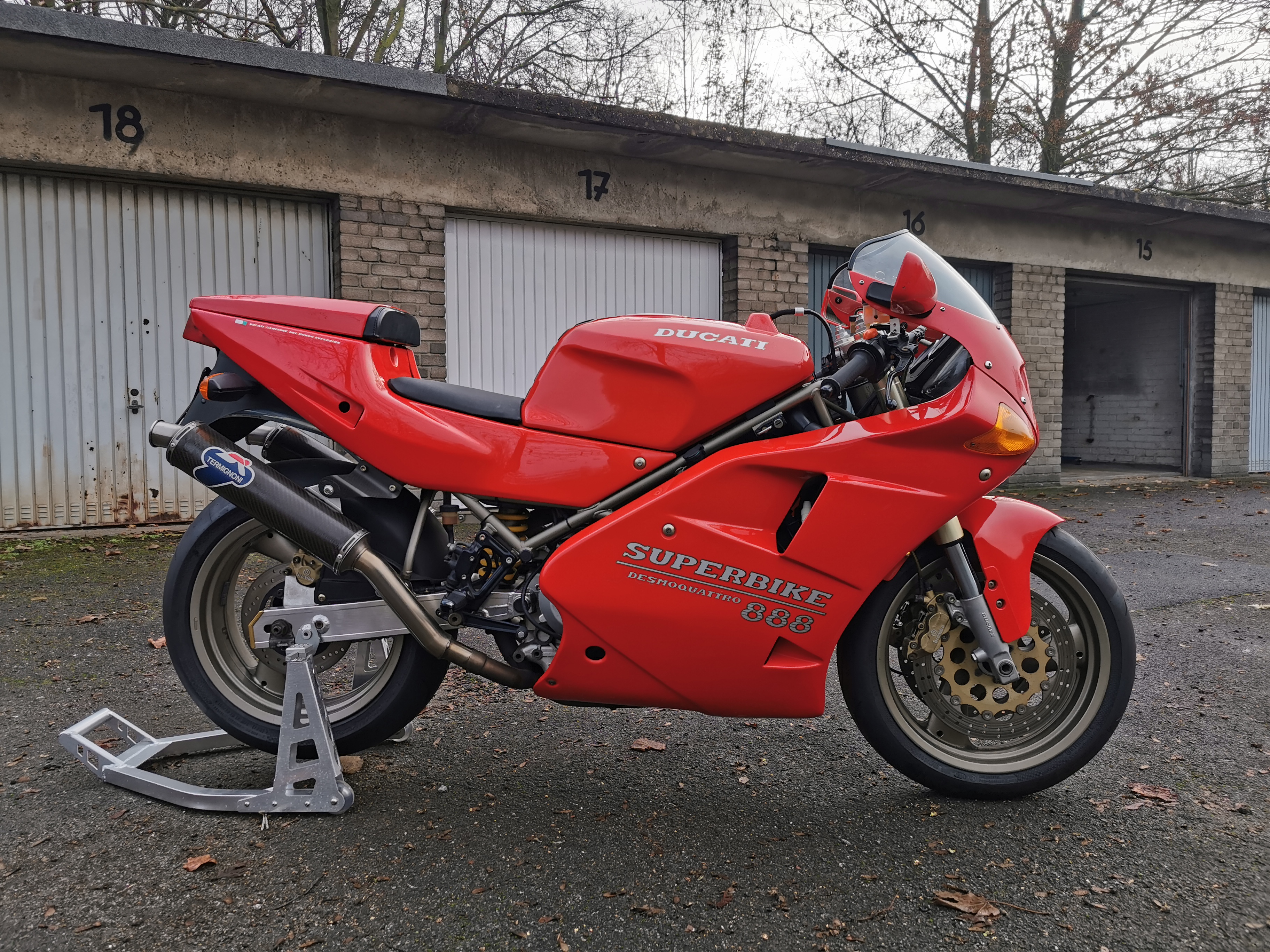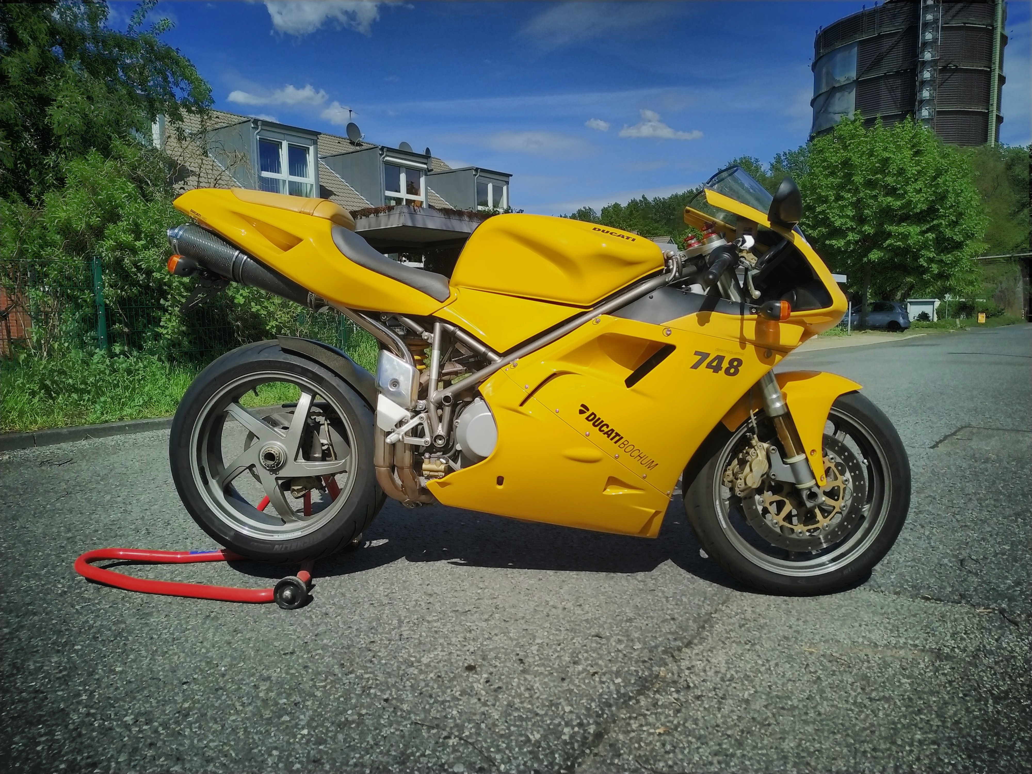 Guest fözzi Posted February 15, 2021 Share Posted February 15, 2021 Hier ein Moped, das ich in den 90ern hatte: Ducati 900 Superlight - 1992 Das Foto zeigt die im Ducati Museum ausgestellte 900 SL. Wesentliche Unterschiede zur 900 SS, die mir gerade noch einfallen, waren: Monoposto Sitzbank hochgelegte 2-2 (A11/B11 bei meiner "deutschen" - A04/B04 bei den italienischen) Marvic / Akront Magnesium-Komposit-Räder vollschwimmende Guss-Bremsscheiben verstärkte Schwinge offener Kupplungsdeckel Carbon Schutzblech, vorn obere Gabelbrücke mit lfd. Nummer Ich hatte noch 'ne Brembo PR19x20 verbaut. Weiter hatte ich ein Veglia Ölthermometer nachgerüstet. War '92 noch nicht Serie. Für eine bessere Kühlung hatte ich den Ölkühler hochgelegt. Original befand sich dieser unmittelbar hinter dem Rad. Diese Position war auch hinsichtlich Steinschlag eher ungüstig. Statt der orig. Schalldämpfer hatte ich offene Sil Moto Carbon montiert. Heute kaum noch denkbar. Die orig. Zündung wurde durch eine von Silent Hektik ersetzt. Und - natürlich - würde auch der Regler getauscht. Mit einem von Bike Affairs aus der Nachbarschaft war irgendwann Ruhe. Die Kompositräder wurden im Rahmen einer Rückrufaktion (angebl. Bruchgefahr) auch gegen 08/15-Aluräder getauscht. Schönes Moped. Musste ich damals abgeben, um einen Motorschaden bei meinem Alfa, mit dem ich ja tagtäglich zur Arbeit fahren musste, kurieren zu können. Ich hätte den dämlichen Alfa lieber abfackeln sollen ... ? Quote Link to comment Share on other sites More sharing options...