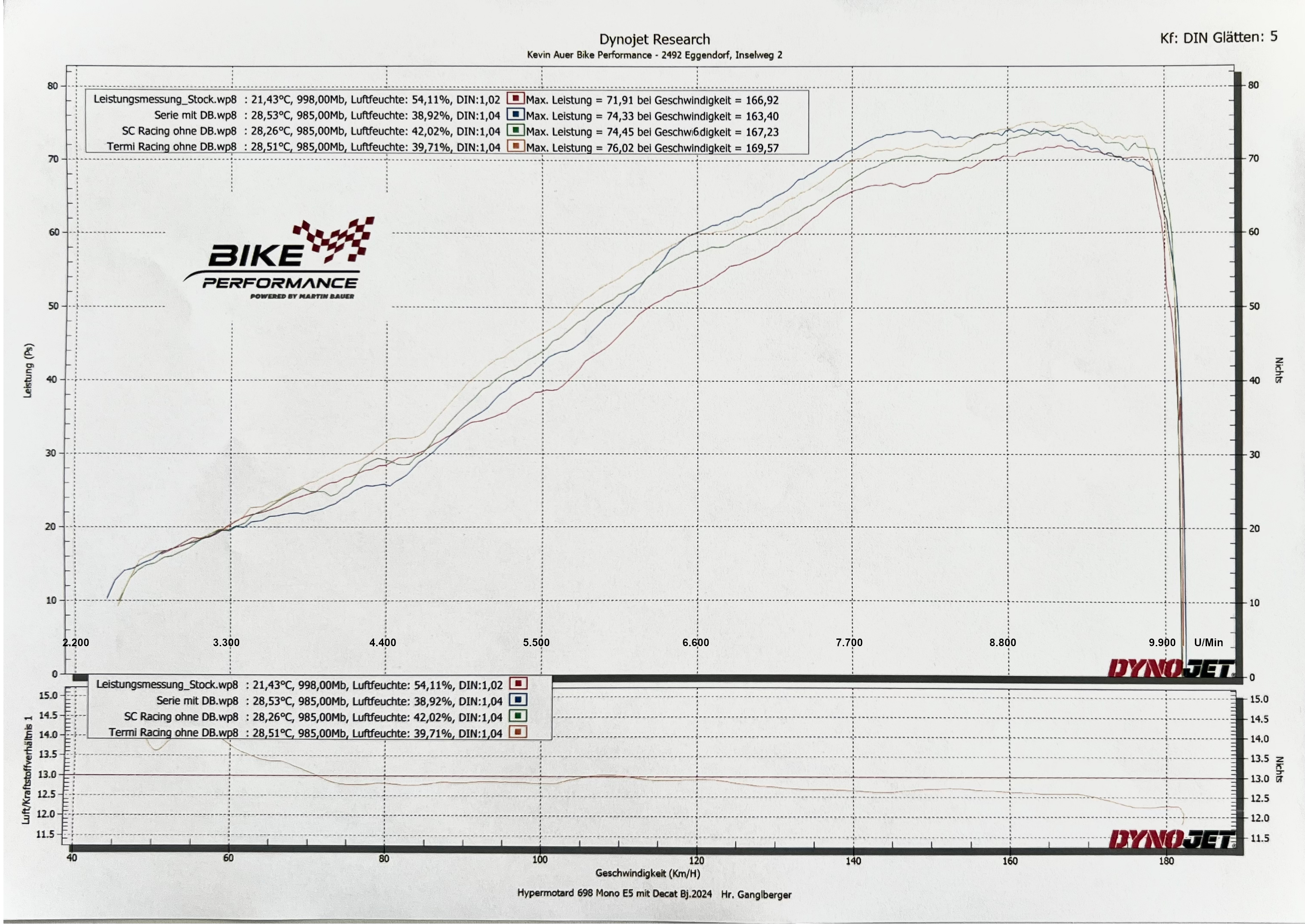 nopain666 Posted September 11, 2025 Share Posted September 11, 2025 Zurück vom "Bike Performance" Prüfstand. Martin Bauer hat höchstpersönlich Hand angelegt. Und das Ergebnis war äußerst interessant. Leistungsdaten: 11. Sep 2025 Termi Decat vs. 2024 Serie mit Kat Hym 698 Mono - Termi Decat - Termi Racing ohne DB - Termi Mapping - LuFi/Airbox: 76,0 PS Max Hym 698 Mono - Termi Decat - SC Project Racing ohne DB - Termi Mapping - LuFi/Airbox: 74,5 PS Max Hym 698 Mono - Termi Decat - Ducati Serientopf mit DB - Termi Mapping - LuFi/Airbox: 74,3 PS Max Hym 698 Mono - Serie mit Katalysator - Ducati Serientopf mit DB - Serienmapping - Serienluftfilter/-Airbox: 71,9 PS Gewichte jeweils beider Endschalldämpfer inkl. Hitzeschutz und Montagematerial Termi Racing ohne DB: 5.270 Gramm Serientöpfe mit DB: 4.370 Gramm SC Project Racing ohne DB: 2.088 Gramm Gewichte der Krümmer ohne Montagematerial Termi Decat Krümmer: 2.050 Gramm Serienkrümmer mit Kat: 3.350 Gramm Interpretation Laut Martin Bauer ist das "Termignoni Racing Mapping" sehr gelungen und er würde nichts daran ändern. Die maximale Leistung erzielt das Komplettsystem mit den Termignoni-Racing-Endschalldämpfern. Die Leistungssteigerung des gesamten "Termi-Racing-Bundles" beträgt rund 4 PS mehr als bei der Serie und etwas mehr als 8 PS bei ca. 5.500 U/Min. Der SC Project ist in erster Linie laut und sehr leicht, erreicht aber mit dem Termi-Decat-Krümmer nicht die Performance vom Termignoni. Die große Überraschung waren die Serientöpfe, die in niedrigen Drehzahlen nicht viel schlechter sind, als die SC Project und ab 6.600 U/min richtig zulegen. In diesem Bereich bringen sie zwischenzeitlich sogar mehr Leistung auf die Walze, als die Termi-Racing (!). Erst ab 8.500 U/Min bauen die Serientöpfe gegenüber den Termi-Racing wieder ab. Für mich heißt das... 1. Auf der Rennstrecke fahre ich die Termignoni-Racing-Endschalldämpfer ohne DB. Auf Rennstrecken mit DB-Beschränkung mit. 2. Auf der Landstraße stecke ich ruhigen Gewissens die Ducati Serientöpfe drauf. Zu mager läuft da nichts mehr. 3. Die SC Project hebe ich mir als Reserve auf oder fahre sie, wenn besonders hohe Sturzgefahr herrscht. 5 2 Quote Link to comment Share on other sites More sharing options...