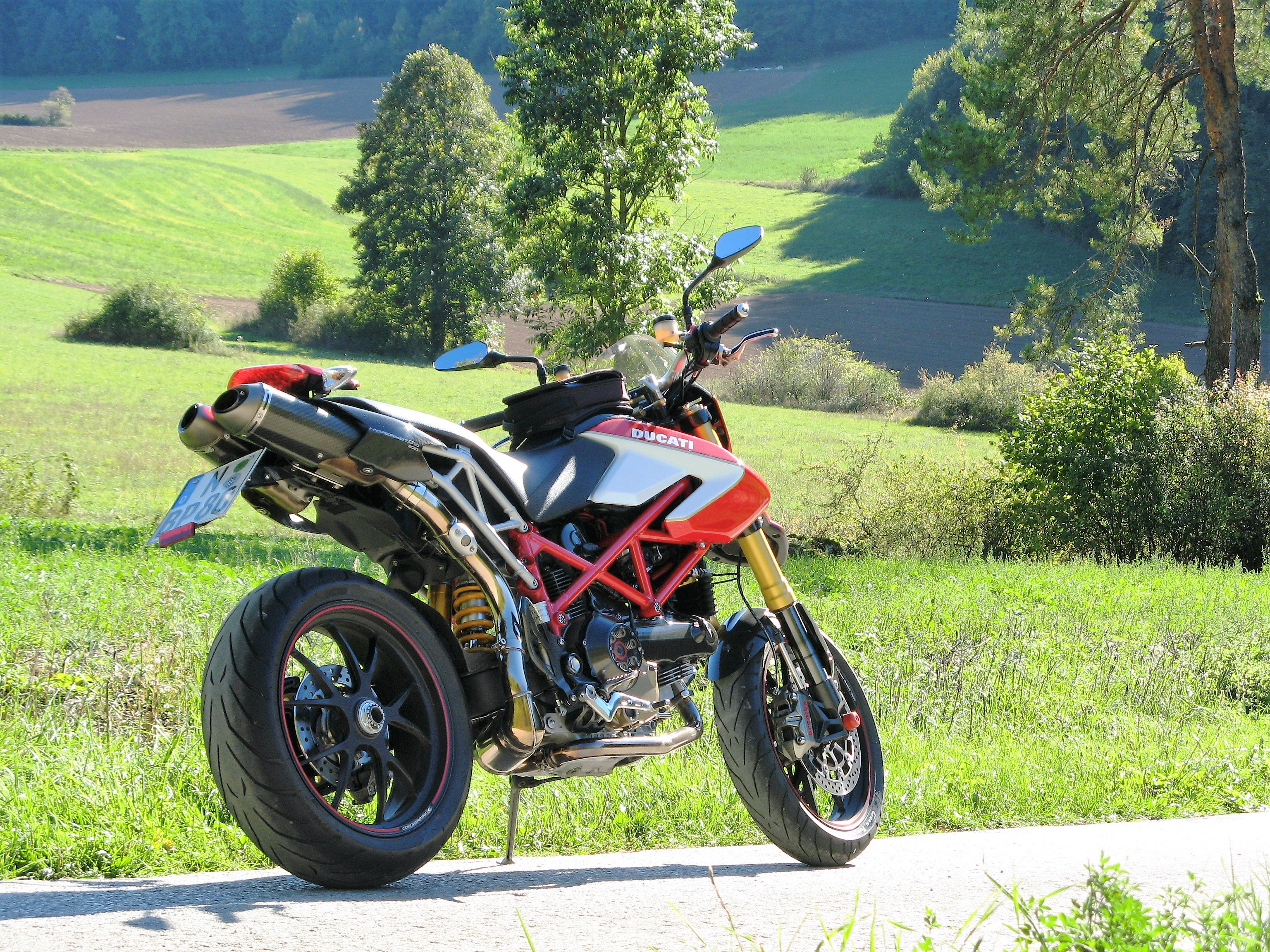nilo Posted September 27 Share Posted September 27 Hallo Zusammen, ich bin dann jetzt wohl öfter hier. Mir ist heute eine Hyper 1100 S aus 2007 zugelaufen. Die gute braucht ein bisschen Liebe und ich suche inspiration. Eigentlich war mein Plan eine "gut abgehangene" zu kaufen, um damit den Alltag zu bestreiten, am Ende ist es ein schwarzes Exemplar, mit 22k auf der Uhr und in nahezu Originalzustand geworden. Der Preis war einfach zu gut. Neben der Hyper schläft eine eigenhändig voll restaurierte S4RS. Zusätzlich steht eine MTS1200s im Familienfuhrpark zur Verfügung. Ich schraube selbst und hab natürlich direkt wieder was zu tun. Öl, Riemen, Ventilspiel. Fahrwerk vorne zu weich, hinten zu hart. Original Handguards fehlen leider, da versuche ich jetzt mal welche aufzutreiben. Touring Scheibe soll dem Original Knubbel weichen. Schwarze OEM Bremshebel für die Optik wären nett. Zudem stehen eine AGA und ein Heckumbau auf dem Wunschzettel. AHK kommt, wenn die Kupplung dann mal fällig ist. Aber eins nach dem anderen. Erstmal den Papierkram erledigen und die Wartung. Grüße in die Runde 1 Quote Link to comment Share on other sites More sharing options...