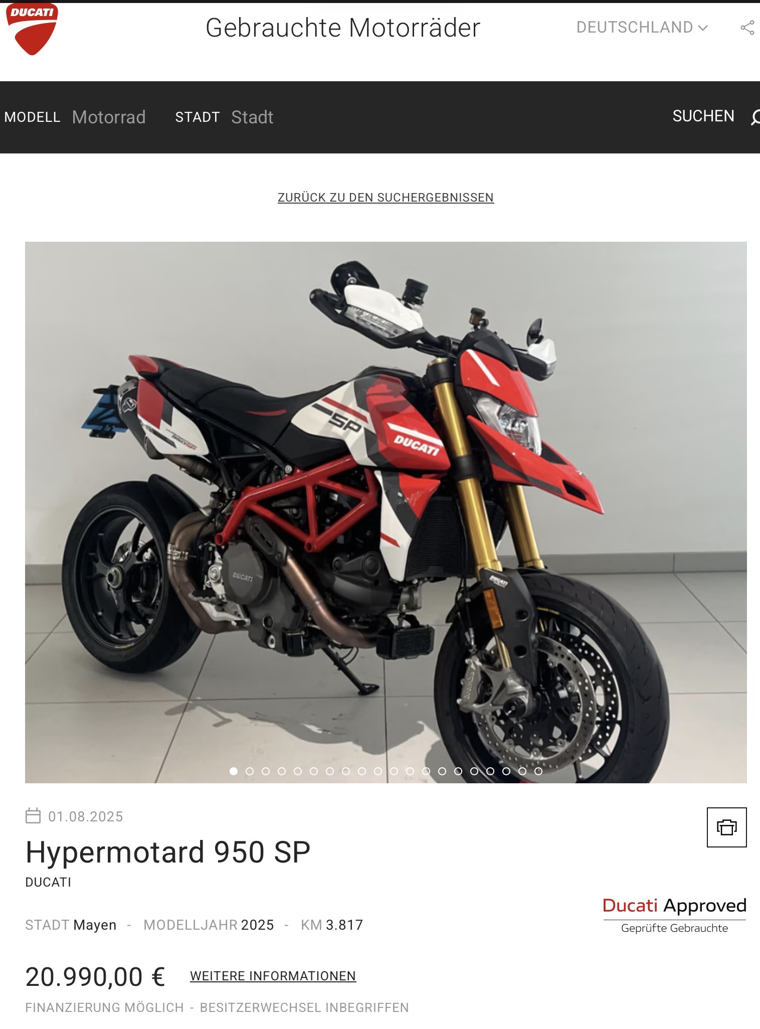 Anthony Posted November 6, 2025 Share Posted November 6, 2025 (edited) vor 10 Stunden schrieb MiketheBike: Was andere noch für einen Preis aufrufen, für eine gebrauchte 950 SP, zwar mit toller Ausstattung, da ist der aktuelle Neupreis nicht weit entfernt. Ein Freund von einem Freund hat mir seine 950 SP unlängst für 24k angeboten 🙈 War allerdings auch ne Menge CNC Lamette dran. Hatte ihn nur ausgelacht, aber er ist das Teil mittlerweile tatsächlich losgeworden. Weiß jedoch nicht, ob er nochmal mit dem Preis runter ist. Edited November 6, 2025 by Anthony Quote Link to comment Share on other sites More sharing options...