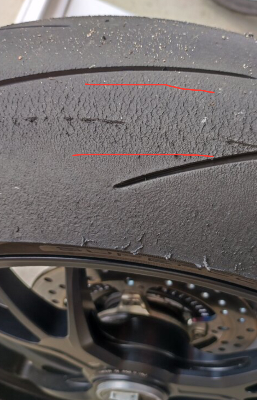 SMY Posted July 31, 2025 Share Posted July 31, 2025 Nicht korrekt durchgewärmt ist eine Ursache. Du fährst den Reifen zwar auf Kante, aber man sieht, dass Du eigentlich genau auf der Trennung der Bi-Compound-Mischung (zwischen den roten Linien) erst wieder ans Gas gehst. Die Weiche Mischung arbeitet mehr, die harte weniger und schon trennen sich die Mischungen bzw. reißen oberflächig etwas auseinander. Das mag der SP V3 nicht so. Kann konstruktiv nicht ganz so optimal gelöst sein. Hab ich beim V3 auch schon öfter gesehen. Der Riss geht aber nicht bis auf die Karkasse runter. Sind meist nur 1-2mm tief. Fährt sich wieder raus. Kein Grund den Reifen zu tauschen. Der neuere SP V4 hat das Phänomen nicht. Der hat drei Mischungen drauf und die Übergänge sind nicht so krass unterschiedlich. Hatte das Bild vergessen🙈 1 Quote Link to comment Share on other sites More sharing options...