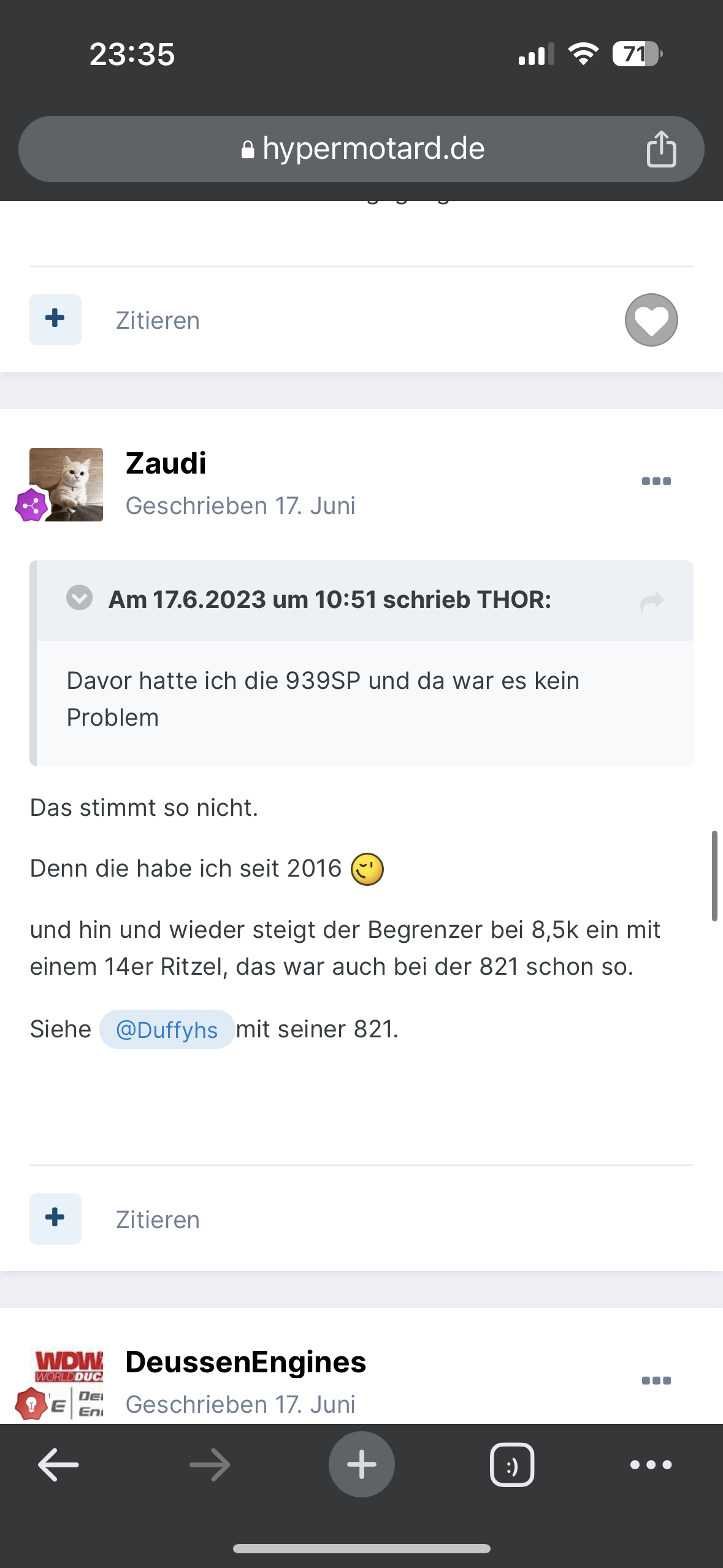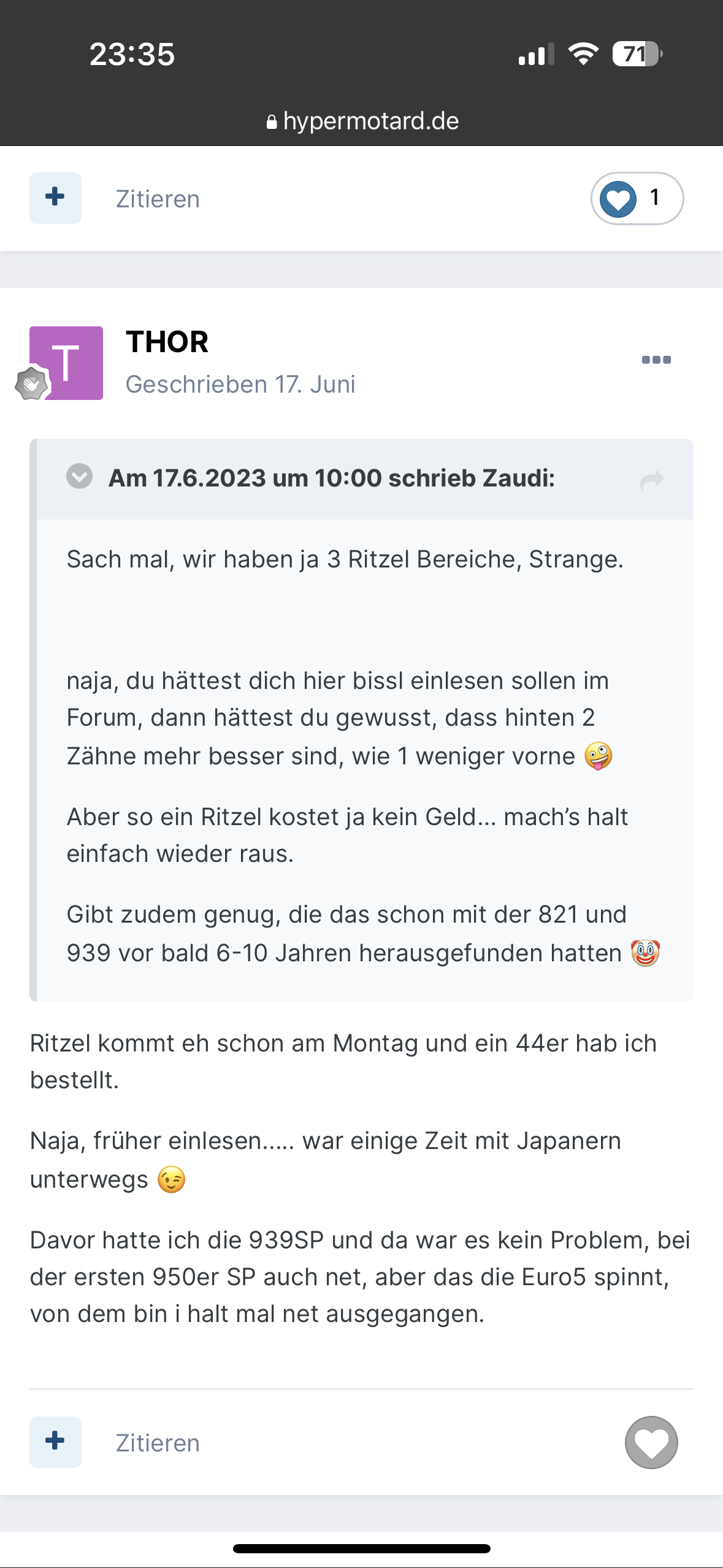 Sailor Fortune Posted June 25, 2023 Share Posted June 25, 2023 vor 5 Stunden schrieb Zaudi: Jetzt ließ doch erstmal was passiert ist, bevor du dein Senf abgiebst. Langsam habe ich das gefühlt im falschen Film zu sein. Wenn ich dir sage, der neue Shoei XX Helm ist laut, du sagst, nein der ist mega leise aber den XY meinst!!! Dann hast du nicht gelesen und verstanden was geschrieben wurde. so schwer ist das jetzt doch nicht oder? 😂 Du kannst dir sicher anders Verständnis verschaffen als mit diesem Umgang. @THORhat mittlerweile sicher verstanden dass die Euro5 anders tickt . Unter 4 Augen riskierst Du den Ton ganz sicher nicht, dann lass es besser auch hier. Wie gesagt, mach mal wieder was mit der Karre, kommst sicher drauf ! BTW noch bisl Öl aufs Feuer: Wie Du evtl. nicht gemerkt hast war ich hier schon früher beteiligt und erwähnte das es bei -meiner- 939 mit zahlreichen Übersetzungsvarianten keine Herausforderungen gibt. Straße, Renne, vorne, hinten, kürzer und mittlerweile auch mal auf länger geändert, alles gnadenlos fein. 1 Quote Link to comment Share on other sites More sharing options...