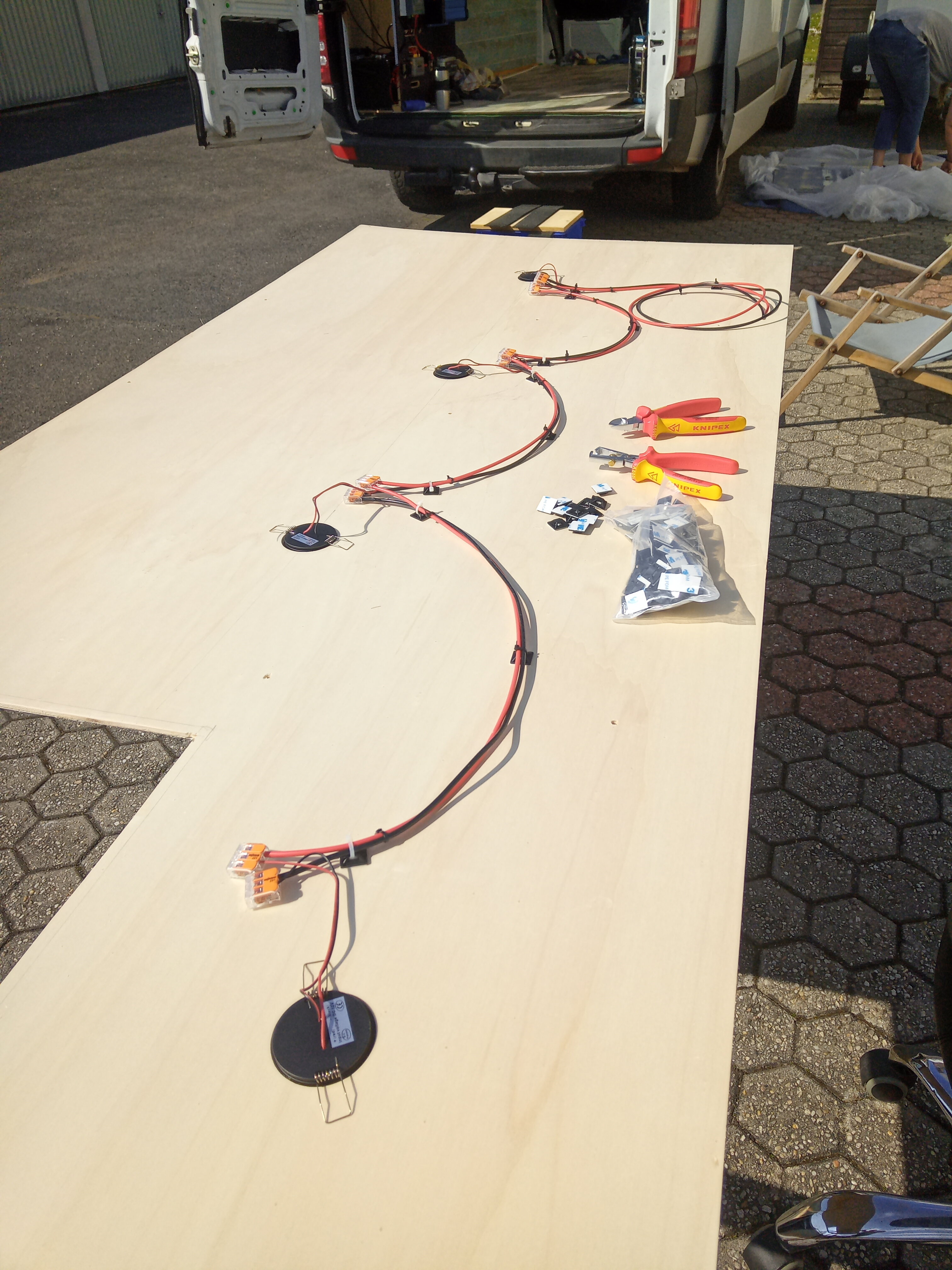Super-Moto Posted March 27, 2022 Author Share Posted March 27, 2022 Projekt Camper 1.0 Yippiiieh ....RICHTFEST Die arbeiten an den oberen elektrischen Kreisläufen sind erledigt und nun kann es endlich unten weiter gehen. Insgesamt haben wir 4 Lichtkreisläufe und einen Ventilator drangehangen. Und alles funzt wie es soll. Alle 12 LED's verbrauchen insgesamt max. 36Wh. Also superniedriger Verbrauch und somit für autarke Camper wie gemacht. Für die Kabel-Verbindungen nutze ich in der Regel Wago-Klemmen die es in unterschiedlichsten Anordnungen, Größen und Varianten gibt. Vorteil von den Dingern ist das extrem einfache und blitzschnelle anklemmen am Kabelgedöns. Und ein weiterer riesen Vorteil "Zumindest für meine Verkabelung" ist, das ich ohne jede Schwierigkeit 6mm2 mit z.B. 0.5mm2 Kabel miteinander verdrahten kann. Damit die Kabel an Ort und Stelle bleiben habe ich sie mit Klebe-Penöbsel "Wie heißen die Dinger eigentlich wirklich ?...Habe ich glaube ich aber schon mal gefragt " an der Decke fixiert. Jetzt müßen nur noch Be.- und Entlüfter verkleidet werden und dann sieht es gleich nochmal etwas besser aus. Die Hauptdecke wurde so verkabelt das sie an einem Stecker ausserhalb der Deckenverkleidung getrennt werden und dann mit ein paar Schrauben innerhalb von ein paar Minuten von der Decke abgehangen werden kann. Also falls es irgendwann mal ein elektrisches Problem oder ein Feuchtigkeitsproblem geben sollte, kann man das durch einfaches abhängen der gesamten Decke innerhalb von ein paar Minuten erledigen. Das gleiche gilt für die Verkabelung der doppelten Schrankböden. Die Verkabelung läuft einmal komplett durch den Schrankboden durch die Schrankwände bis ans Ende. Verdeckt wird dies durch die inneren Schrankböden in die die beste Praktikantin der Welt zusätzlich ein paar Kabelkanäle rein gefräst hat damit die Böden auch auf den Leisten und nicht auf den darüber geführten Kabeln aufliegen. Gehalten werden die Böden mit Klettband die auf die Leisten getakert werden. Somit ist man ruckizucki an der Elektrik falls mal was streikt. Auch wenn OBEN jetzt an der ein oder anderen Stelle noch etwas zu tun ist und das Finishing "Kantenschutz, Kabelkanäle usw" auch nochmal etwas arbeit macht, so haben wir hier jetzt einen großen Schritt zum fertigen Camper gemacht. Die nächsten Schritte werden das fertigstellen des Gaskastens, die Küche, Sitz, Tisch und weitere elektrische Anschlüße zum Fußraum sein. Dazu muß die Kühlbox, Frisch.- und Abwasserbehälter, Wasserpumpe, Gasleitungen und diverse KFZ. und USB-Anschlüße verbaut werden. Achja und das wichtigste natürlich auch....Das Bett Meine vorherige Meinung zur Tischkreissäge muß ich allerdings ein wenig relativieren. Natürlich geht mit der Tischkreissäge nach wie vor alles das was auch auf einer Kappsäge geht. Allerdings habe ich erst jetzt wirklich realisiert das mit einer Kappsäge wirklich sehr viele arbeiten wesentlich leichter, schneller und auch supergenau gehen. Nachdem ich meine gute Makita Kappsäge verkauft hatte und mich die Ernüchterung bei der Arbeit mit der Tischkreissäge sozusagen erleuchtet hat, habe ich mir nun die Makita Kappsäge erneut gekauft. Es war einfach zu schön mit ihr....und eine bestehende Liebe sollte niemand trennen ... "Meint im übrigen auch die beste Praktikantin der Welt " Zu guter letzt haben uns die Nachbarn dann auch noch mit einem Festmahl aus der Balkanküche überrascht. Da ist sozusagen aus einem Familientreffen der Nachbarn ein üppiges Mittagsessen für uns geworden. Naja, wir haben aber auch lange genug sabbernt über den Zaun geschaut Die beste Praktikantin der Welt ist satt, ich bin satt, die arbeiten OBEN sind fertig und bewundert haben wir das mit einer Flasche Bier in der Hand und mit weiteren Nachbarn die zwischendurch immer mal gucken kommen, dann für den Rest des Nachmittags Aus handwerklicher Sicht ein perfekter Sonntag 5 Quote Link to comment Share on other sites More sharing options...