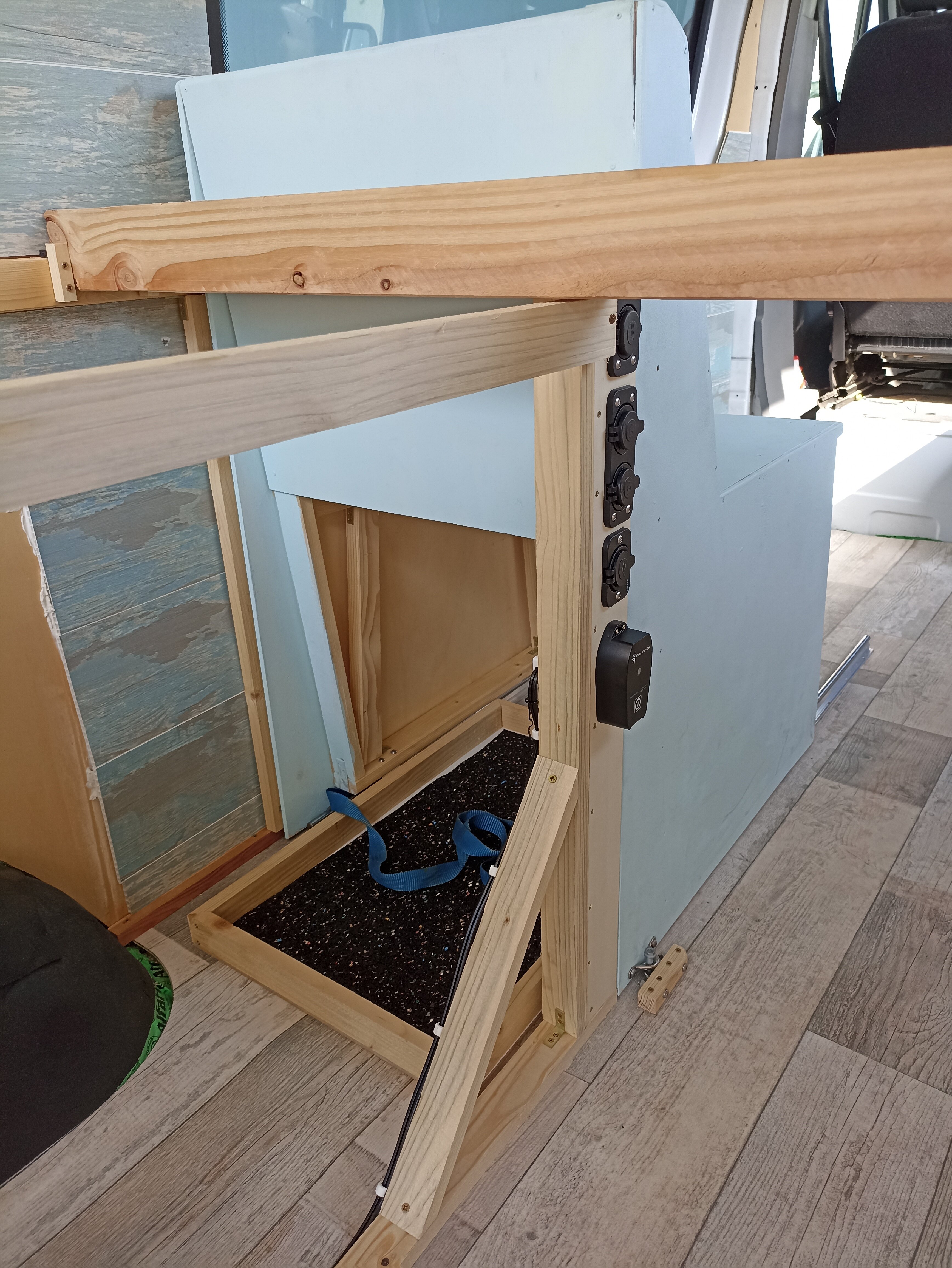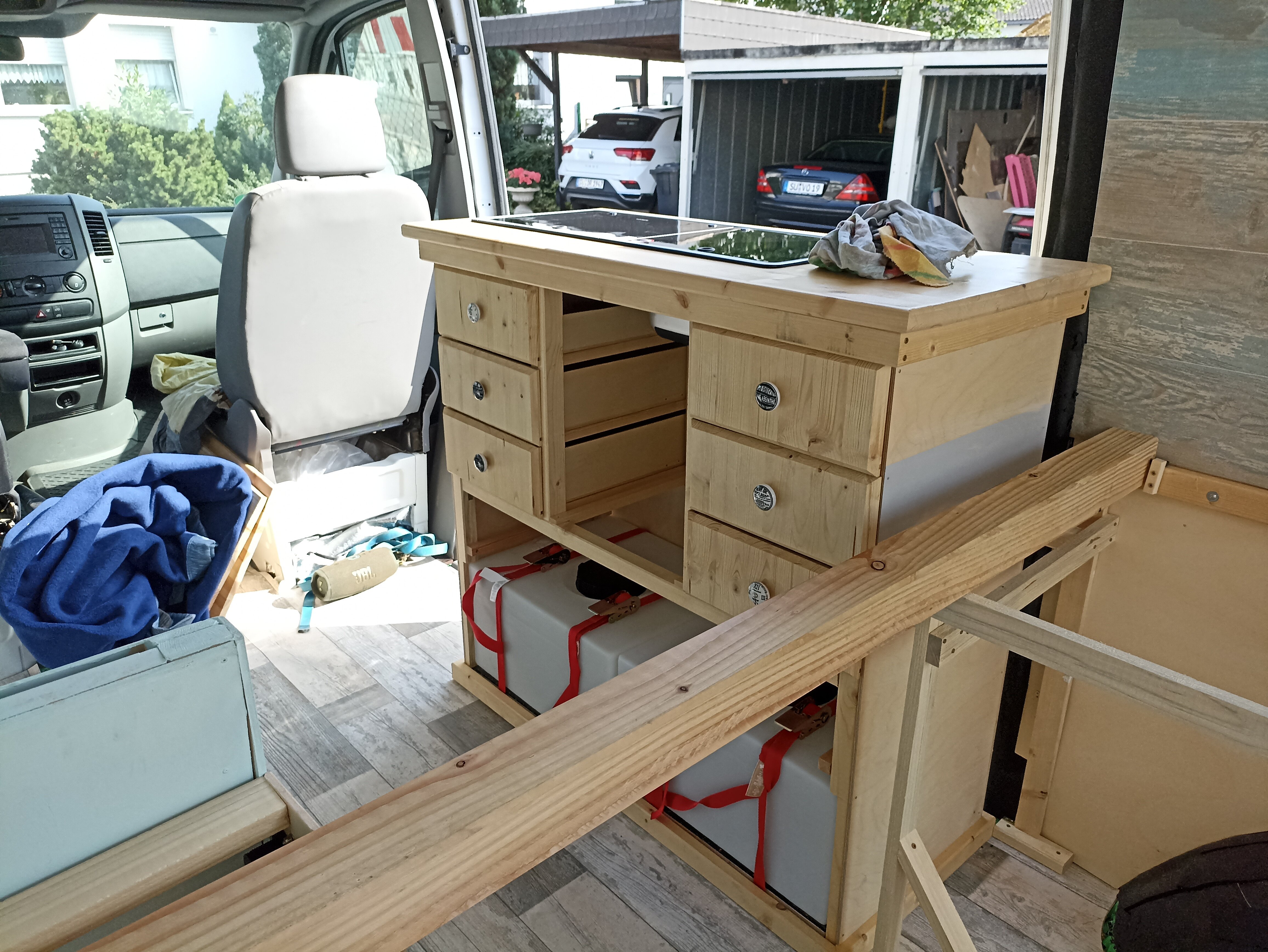 Super-Moto Posted June 19, 2022 Author Share Posted June 19, 2022 Und weiter gehts mit Schubladen Elektrik, Kühlboxverschalung und so Kleinkram 🙂 Das lange trockene WE war perfekt um einen weiteren Schritt Richtung Camperurlaub zu machen. Wir haben einiges geschafft und zu meiner Erleichterung sind wir jetzt wieder vor dem Zeitplan. Wie ich ja bereits erwähnt hatte, kann ich vielleicht sogar den Gaskasten fertig machen. Allerdings muß ich dann aufpassen das ich mich bei der übrigen Arbeit nicht zu sehr in den Details verliere weil die tausend Kleinigkeit mehr Zeit rauben als man meinen mag. Gestern und Heute haben wir noch die Stecker "USB, KFZ-Strom" gelegt, einen Zigarettenanzünderstecker unters Bett verbaut und an Strom angeschloßen "an dem hängt dann die Kühlbox", den Funkempfänger und Sender für den Wechselrichter verbaut "Damit man nicht immer unters Bett muss um die 230V Stromquelle einzuschalten" und die Schale für die Aufnahme der Kühlbox geschreinert und im Sprinter verschraubt. Die Schale ist notwendig weil die Kühlbox natürlich auch bei harten Bremsungen stabil stehen muß. Die Kühlbox wird dann auf einem rutschfesten Belag mit einem Spanngurt in diese Schale gespannt und steht somit bombenfest. Die Küchenzeile mußte ich leider teilweise nochmal auseinderschrauben um die Verstrebungen ein wenig zu versetzen. Als Metaller meint man es mit der Maßgenauigkeit oft viel zu gut so das die ein oder andere Schublade doch etwas sehr ruppig zu öffnen und zu schließen war. Jetzt, nachdem wir für ca. 5mm mehr Luft gesorgt haben, fluppt alles wie es soll. Die großen Schubladen sind bereits vorgefertigt und warten darauf das ich Wochentags wieder die Kreissäge anschmeißen darf um sie fertig zu machen. Jetzt werden noch die restlichen Schubladen fertig geschreinert, die USB, KFZ-Strom, und Schuko Stecker verkabelt und dann geht es endlich weiter mit der Gasbox/Anschluß. 2 Quote Link to comment Share on other sites More sharing options...