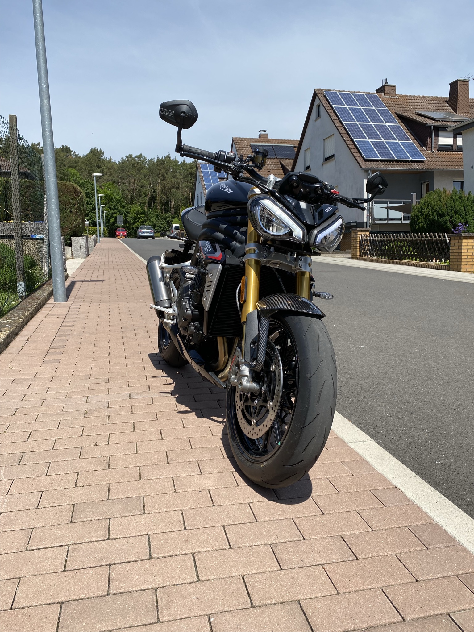 Super-Moto Posted June 1, 2021 Share Posted June 1, 2021 vor 1 Minute schrieb HY95: Leider hat es mit der 1290 Super Duke R nicht geklappt, da sie für diese Woche vermietet ist. Okay hab ich mir gedacht, dann fährst halt mal zum Triumph Händler deines Vertrauens und schaust ob dort die neue Speed Triple RS steht. Stand tatsächlich eine da und schwups gleich mal eine Probefahrt gemacht. Hätte ich nicht machen sollen. Gefällt mir sehr gut die Maschine. Schön fleischig und druckiger 1200er Triple, Ergonomie für mich perfekt. Kann schön Schaltfaul gefahren werden und Super sanfter bei allen Drehzahlen funktionierender Schaltassistent. Aber trotzdem will ich noch das Beast 3.0 Probefahren. Mal schauen, wie es weitergeht. Ich hatte die erste Generation der Speed Triple. Sehr unterhaltsames Gerät. Und die Optik war damals ungeschlagen. Allerdings haben die Glubschis die Gemeinde gespalten :-)....Ich fands cool. Auch schon wieder 25 Jahre her... . Quote Link to comment Share on other sites More sharing options...