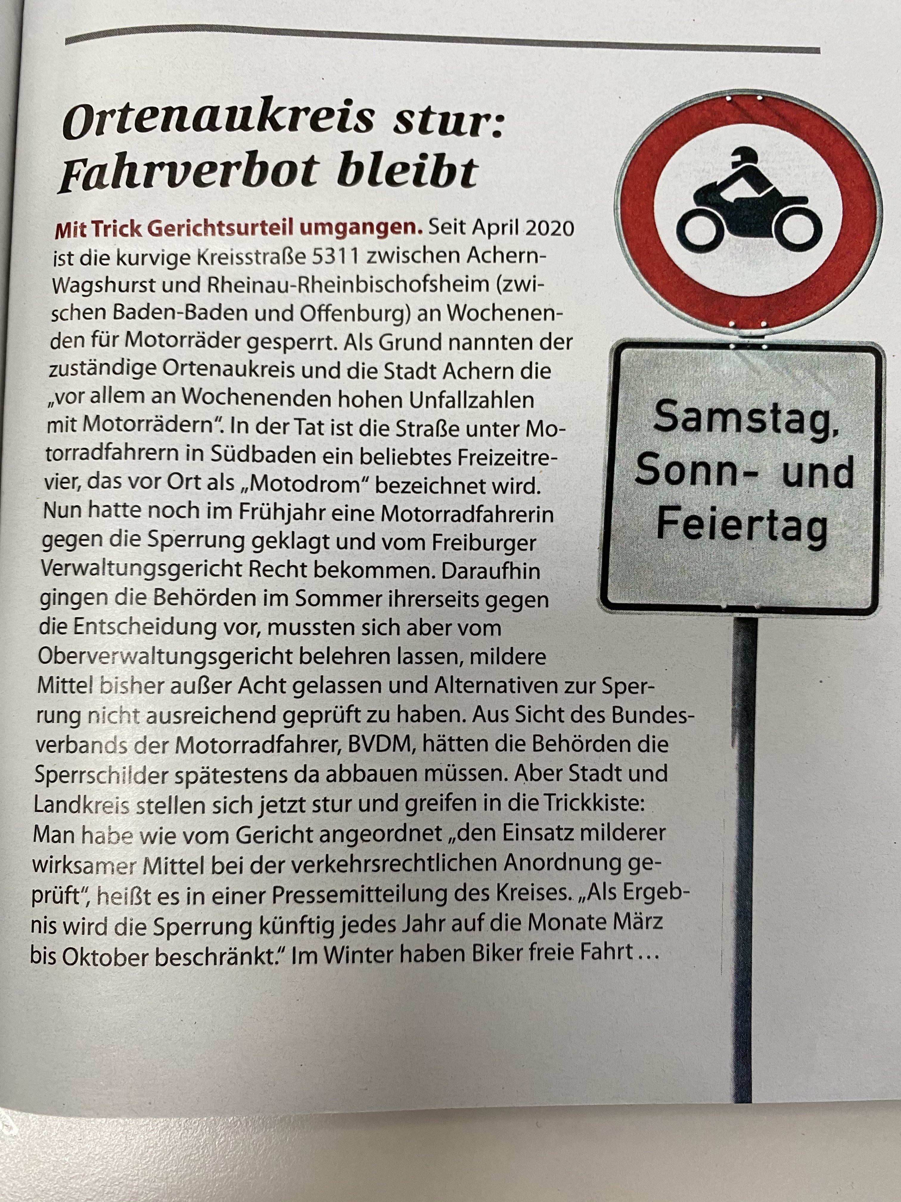 Mechanist Posted July 18, 2018 Share Posted July 18, 2018 vor 3 Stunden schrieb RainerS: Diskussionen über Streckensperrungen erscheinen mir scheinheilig - im wahrsten Sinne des Wortes.? (Sorry, musste sein und ich mach das genauso) Rainer, ich finde Deinen Kommentar ganz überwiegend weise und gut! Da gibt es ja auch noch einen Bibelspruch zu, irgendwas mit Auge, Splitter und Balken. Im übrigen muss man im Prinzip Sperrungen für Moppeds nur dann akzeptieren, wenn Gerichte geurteilt haben, dass das was die Behörden beschlossen haben auch rechtens ist. Z.B. hat der BVDM schon einige Erfolge erreicht vor Gericht gegen Streckensperrungen erreicht, was gut zeigt das das was die Behörden und die Politik beschließen nicht immer das gelbe vom Ei ist. Ich finde es auch ganz normal das Mopped- Treiber ihre Sicht der Dinge und ihre Interessen in den Vordergrund stellen, und es kann und darf doch im hier im speziell diskutierten Fall nicht sein, dass die Staatsmacht vor ein paar Kids auf Speed kapituliert und Sanktionen gegen alle verhängt, da stimmt doch m.E. was nicht. Beste Grüße Lutz Quote Link to comment Share on other sites More sharing options...
