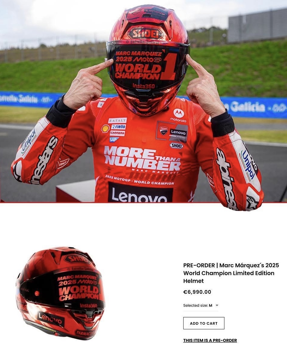 MiketheBike Posted November 7 Share Posted November 7 vor 5 Stunden schrieb DocPolo: Falls jemand noch nen standesgemäßen Helm sucht, Shoei bringt da was passendes…. Schade, wollte den grad bestellen, aber es gibt ihn nur in der Größe M, brauche aber XL…na ja Pech gehabt! Ich wollte schon immer einen Helm, der teurer als mein Motorrad ist! https://marcmarquez93.com/en_int/pre-order-marc-marquez-s-2025-world-champion-limited-edition-helmet.html 1 Quote Link to comment Share on other sites More sharing options...